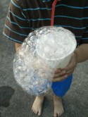 Um einfache kleine Seifenblasen herzustellen kannst du einfach einen kleinen Pappbecher zu einem viertel mit Wasser füllen, oberhalb des Wasserrandes ein kleines Loch reinschneiden, darin einen Strohhalm stecken und in das Wasser zwei Tropfen Spülmittel rein tropfen lassen.