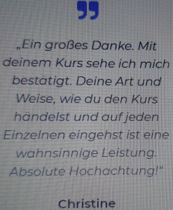 Dann habe ich hier ein paar Stimmen, der Teilnehmer, aus dem ersten Kurs:
