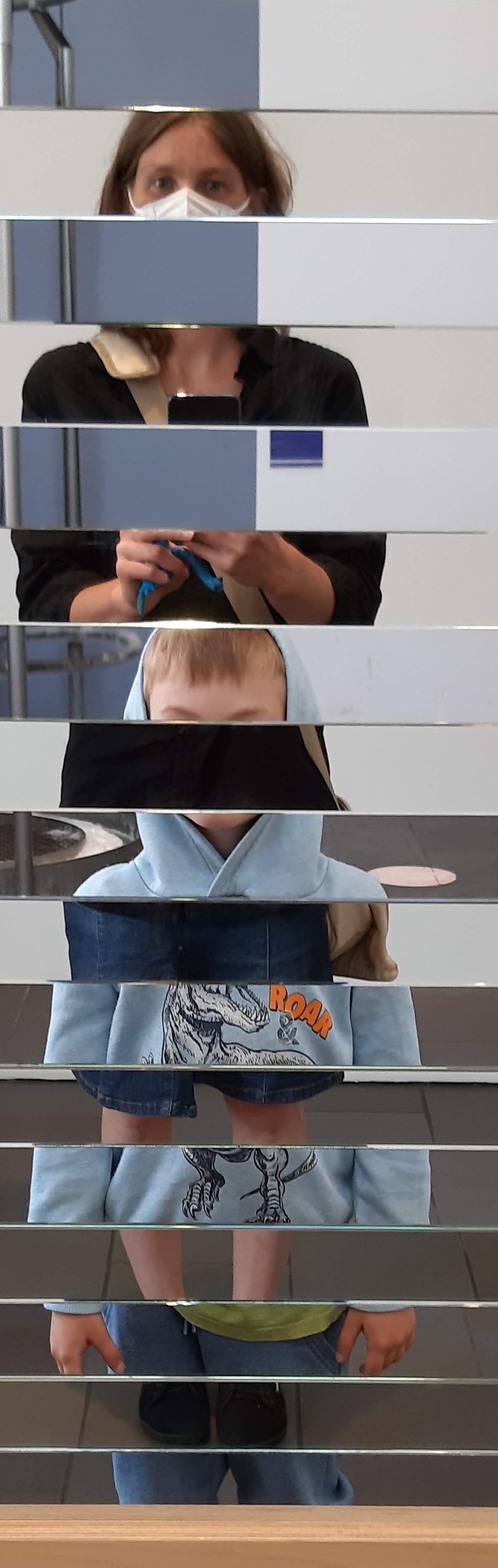 Und dann standen wir plötzlich vor einem geteilten Spiegel: ich auf der einen Seite, mein Sohn auf der anderen Seite, in einem möglichst gleichen Abstand zum Spiegel