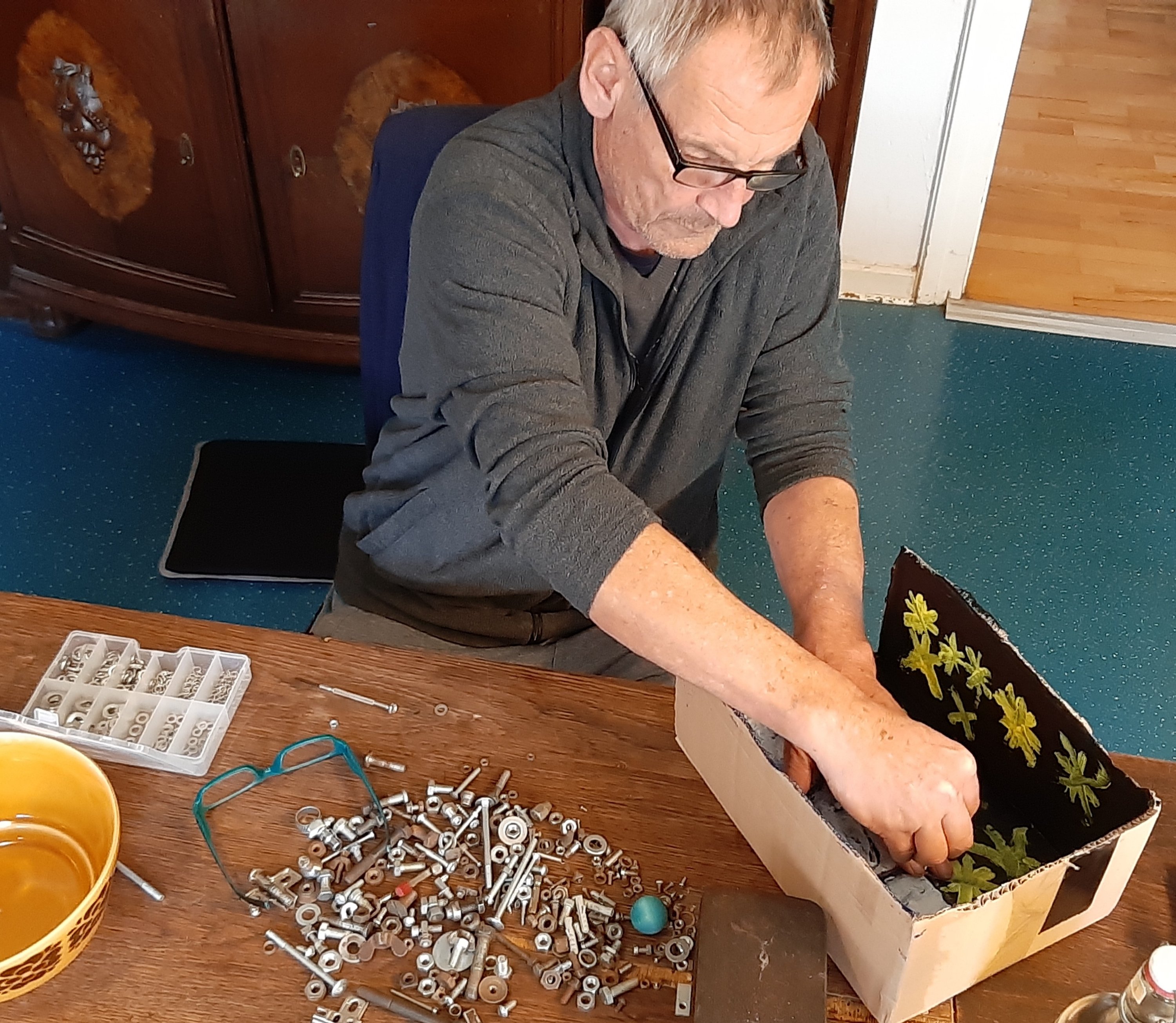 Anschließend haben wir mit einer Schraube, einer Mutter und einer blau angemalten Holzkugel die Erdposition festgelegt.
