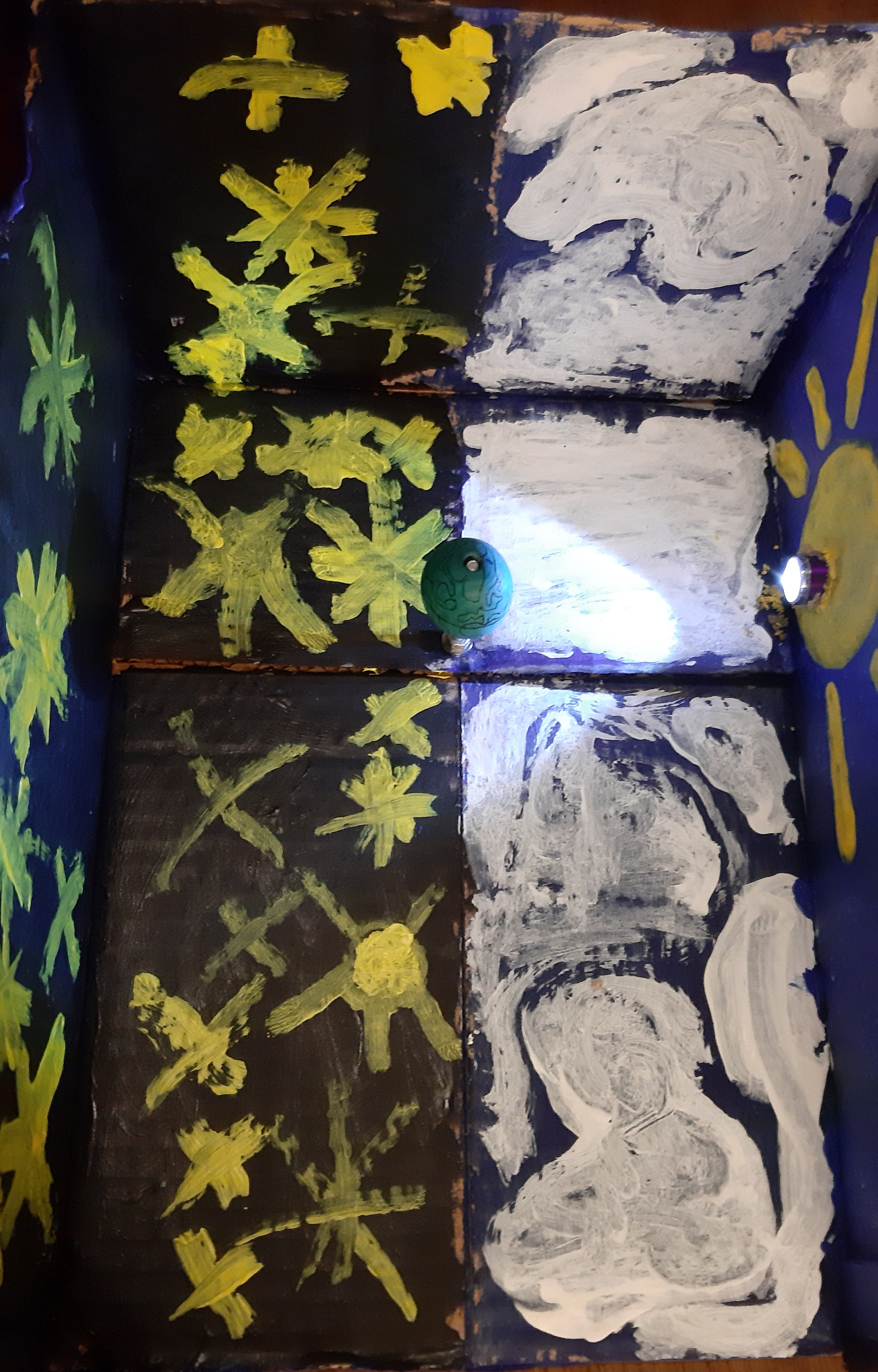 Als diese dann stand haben wir an der rechten Seite des Kartons ein Loch reingeschnitten, was so groß ist, das eine Taschenlampe rein passt. Um dieses Loch haben wir dann eine Sonne in gelb gemalt.