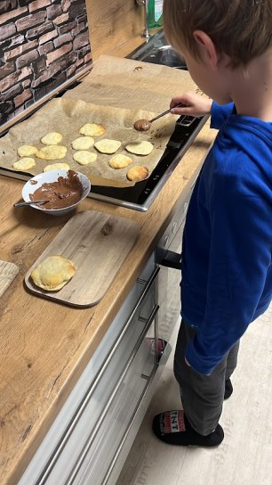 Jetzt, wo mein Sohn lesen kann, hat er das erste Rezept vollständig alleine gelesen und nach Anleitung vegane Orangen – Nougat – Plätzchen gebacken – da war jemand, zu recht, mega stolz auf sich!!! (Und ich erst)