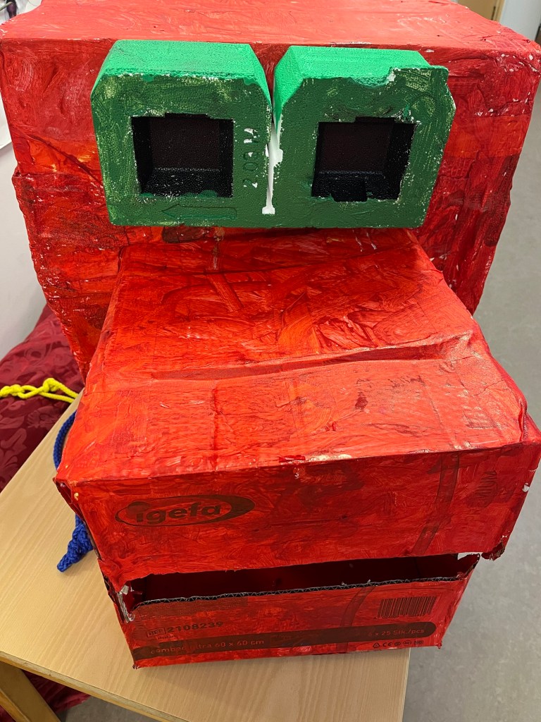 In den letzten beiden Wochen haben die Kinder einen Drachenkopf gebastelt, mit dem wir dann als komplette Kita einen kleinen Umzug gelaufen sind.