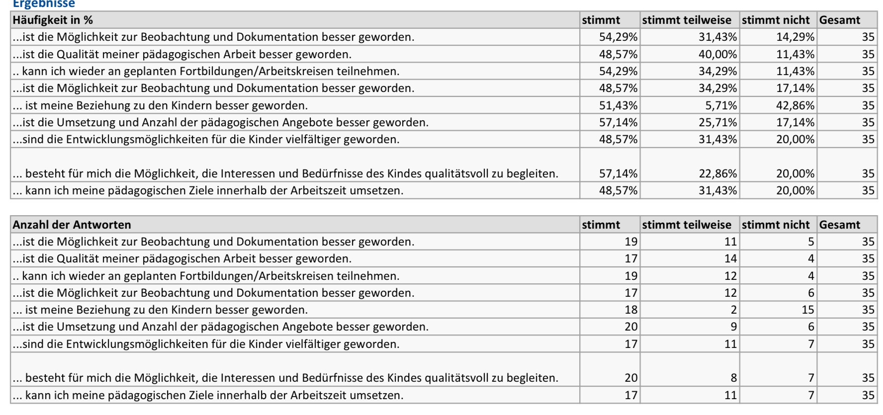 In der Umfrage des Offenburger Modells – Ergebnisse komplett befindet sich auf Seite 48 die Frage 14. Bei dieser stehen in den Ergebnissen die Häufigkeit in %, ob die Möglichkeit zur Beobachtung und Dokumentation besser geworden ist.
