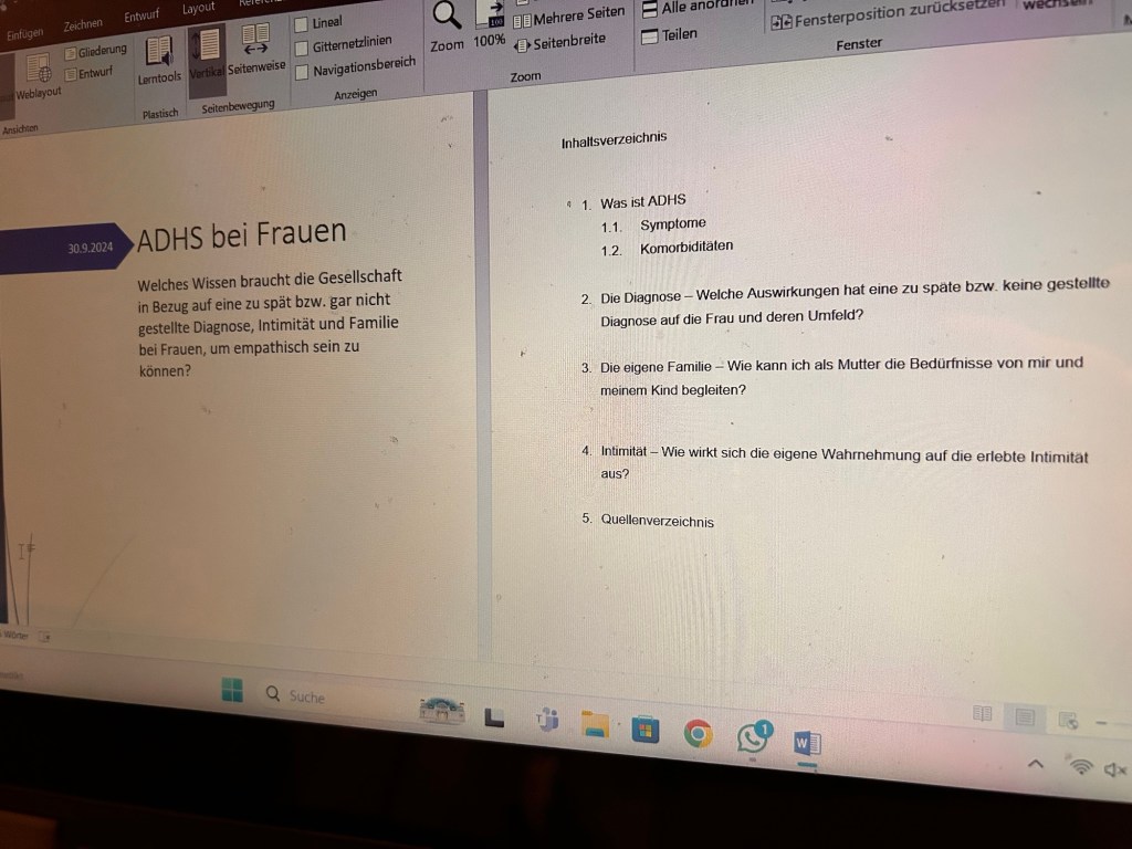 Vielleicht nutze ich die Zeit einfach und schreibe noch ein bisschen an meiner Abschlussarbeit „ADHS bei Frauen: Welches Wissen braucht die Gesellschaft in Bezug auf eine zu spät bzw. gar nicht erfolgte Diagnose, Intimität und Familie bei Frauen, um empathisch sein zu können?“ weiter.