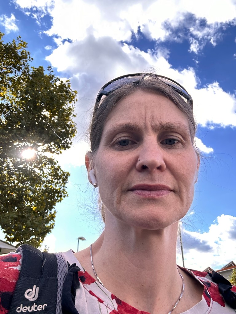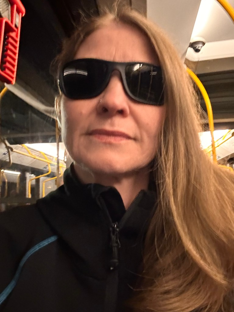 Da ich lichtempfindlich bin sitze ich morgens kurz nach 6 Uhr mit Sonnenbrille im Bus.